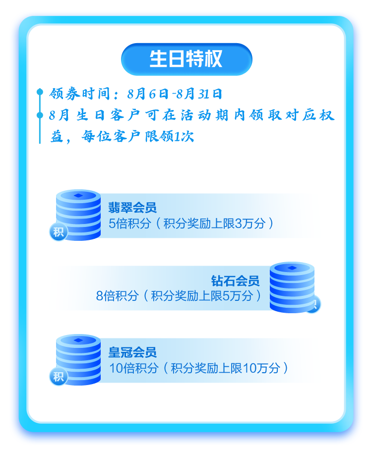 5、翡翠级别以上,生日当月可领:消费5倍/8倍/10倍积分