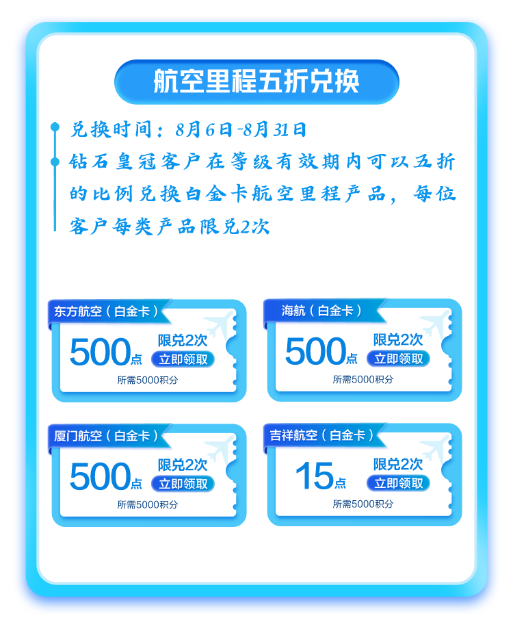 1、钻石/皇冠会员,5折兑换:白金卡航空里程,每类各限2次