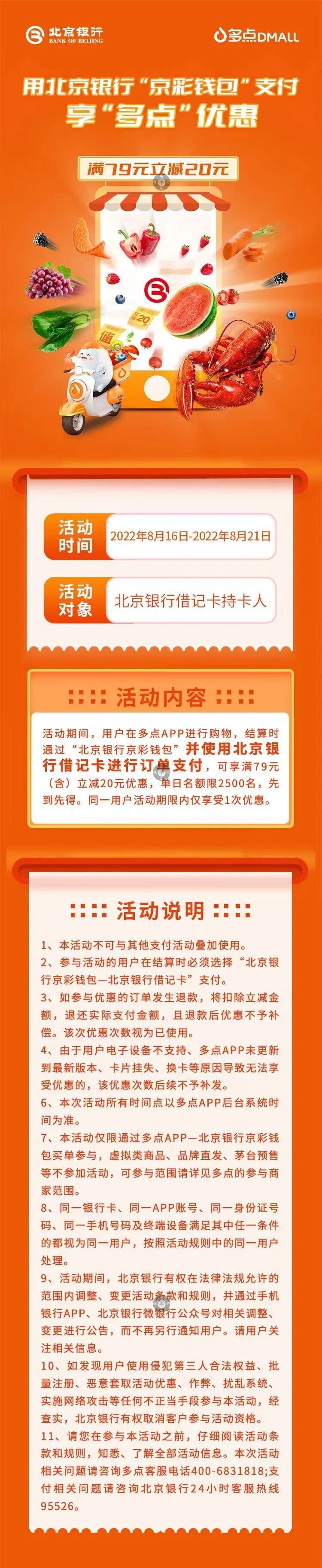 每日,多点APP,北京银行京彩钱包消费,满79减20元,活动期限1次,2500名额