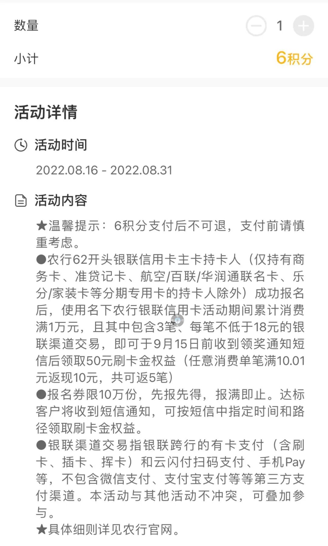 报名,累计消费满1万元+银联渠道消费满3笔18元,可领:50元刷卡金权益(9.15前短信通知),活动期限1次,共10万报名名额