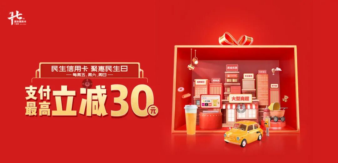 即日起至2022年12月31日(含)每周五、周六、周日 卡片及账户状态正常的民生信用卡主附卡持卡人(仅持有外币单标卡、公务卡、通宝白领卡、新e贷、汽车分期、车位分期、居家乐等信用卡产品的持卡人不可参与)。 活动期间每周五、周六、周日,民生银行信用卡客户在便利蜂APP、小程序、门店(主扫、被扫、刷脸),微信绑定民生信用卡支付,可享受每单8.5折优惠,最多优惠5元,客户需最低支付1元。单客户每日限享受1次,每月最多享受2次。每日名额4000个,名额有限,先到先得。 即日起至2022年12月31日(含)每周五、周六、周日 卡片及账户状态正常的民生信用卡主附卡持卡人(仅持有外币单标卡、公务卡、通宝白领卡、新e贷、汽车分期、车位分期、居家乐等信用卡产品的持卡人不可参与)。 活动期间每周五、周六、周日,民生银行信用卡持卡人在美宜佳便利店线下门店,通过微信支付绑定民生信用卡完成支付,可享受8.5折优惠,最多优惠5元,客户需最低支付1元。 单客户每个活动日限享受1次,每月最多享受2次。每个活动日名额6000个,名额有限,先到先得。 即日起至2022年12月31日(含)每周五、周六、周日 卡片及账户状态正常的民生信用卡主附卡持卡人(仅持有外币单标卡、公务卡、通宝白领卡、新e贷、汽车分期、车位分期、居家乐等信用卡产品的持卡人不可参与)。 活动期间,民生银行信用卡客户在喜茶Go小程序及线下喜茶门店,通过微信支付绑定民生信用完成支付,可享受单笔消费满50元及以上立减15元优惠,最多优惠15元。 单客户每个活动日最高享受1次,每月最多享受2次。每个活动日名额800个,名额有限,先到先得。 卡片及账户状态正常的民生信用卡主附卡持卡人(仅持有外币单标卡、公务卡、通宝白领卡、新e贷、汽车分期、车位分期、居家乐等信用卡产品的持卡人不可参与)。 活动期间每周六、周日,民生信用卡持卡客户在沃尔玛全国门店,使用微信支付并选择民生信用卡完成支付,可享受单笔消费满100元立减20元,最高减20元优惠。 卡片及账户状态正常的民生信用卡主附卡持卡人(仅持有外币单标卡、公务卡、通宝白领卡、新e贷、汽车分期、车位分期、居家乐等信用卡产品的持卡人不可参与)。 活动期间,持卡人通过 “京东到家” APP使用微信支付进行消费时,选择已绑定的民生信用卡支付,可享单笔消费满100元立减20元优惠,最多减20元。 1、活动日每个活动日共1500个名额,同一持卡人每月最多享受2次优惠。 “京东到家” APP-点击“提交订单”——选择“微信支付”——选择民生银行信用卡——点击“确认付款”——输入支付密码——支付优惠结果显示。 2022年8月6日-2022年12月31日(含)每周六、周日 卡片及账户状态正常的民生信用卡主附卡持卡人(仅持有外币单标卡、公务卡、通宝白领卡、新e贷、汽车分期、车位分期、居家乐等信用卡产品的持卡人不可参与) 活动期间每周六日,民生银行信用卡客户在奈雪的茶指定门店或小程序,通过微信支付绑定民生信用卡完成支付,可享受单笔订单消费满30元立减10元优惠,最多优惠10元。 单客户每日限享受1次,每月最多享受2次。每日名额800个,名额有限,先到先得。 2022年8月6日-2022年12月31日(含)每周六、周日 卡片及账户状态正常的民生信用卡主附卡持卡人(仅持有外币单标卡、公务卡、通宝白领卡、新e贷、汽车分期、车位分期、居家乐等信用卡产品的持卡人不可参与) 活动期间每周六日,民生银行信用卡客户在百果园线下门店,通过微信支付绑定民生信用卡完成支付,可享受单笔订单消费满30元立减10元优惠,最多优惠10元。 单客户每日限享受1次,每月最多享受2次。每日名额5000个,名额有限,先到先得。 卡片及账户状态正常的民生信用卡主附卡持卡人(仅持有外币单标卡、公务卡、通宝白领卡、新e贷、汽车分期、车位分期、居家乐等信用卡产品的持卡人不可参与)。 活动期内每周六和周日,民生信用卡持卡人在猫眼APP和猫眼微信小程序通过微信支付时,选择绑定的民生信用卡完成支付,支付成功的前1000名用户即可享单笔实付金额满30元立减10元,最高立减10元的优惠。同一用户每月限享2次优惠,名额有限,先到先得。 卡片及账户状态正常的民生信用卡主附卡持卡人(仅持有外币单标卡、公务卡、通宝白领卡、新e贷、汽车分期、车位分期、居家乐等信用卡产品的持卡人不可参与)。 活动期间每周六、周日,民生信用卡持卡客户在孩子王全国门店,使用微信支付并选择民生信用卡完成支付,可享受单笔消费满100元立减20元,最高减20元优惠。 卡片及账户状态正常的民生信用卡主附卡持卡人(仅持有外币单标卡、公务卡、通宝白领卡、新e贷、汽车分期、车位分期、居家乐等信用卡产品的持卡人不可参与)。 活动期间,民生银行信用卡客户每周六、周日在肯德基门店消费,微信支付时选择民生银行信用卡完成支付,可享受单笔消费满30元及以上立减10元优惠,最多优惠10元。(支付场景包括:手机APP/小程序点餐、堂食点餐线下当面付) 单客户每个活动日最高享受1次,每月最多享受2次。每个活动日名额12000个,名额有限,先到先得。 卡片及账户状态正常的民生信用卡主附卡持卡人(仅持有外币单标卡、公务卡、通宝白领卡、新e贷、汽车分期、车位分期、居家乐等信用卡产品的持卡人不可参与)。 活动期间每周六和周日,民生银行信