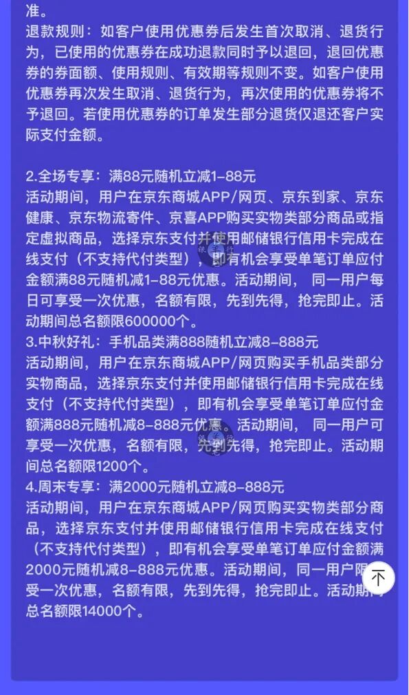 2、每周六、周日,京东购物,满2000元随机减8-888元,活动期限1次,共1.4万名额
