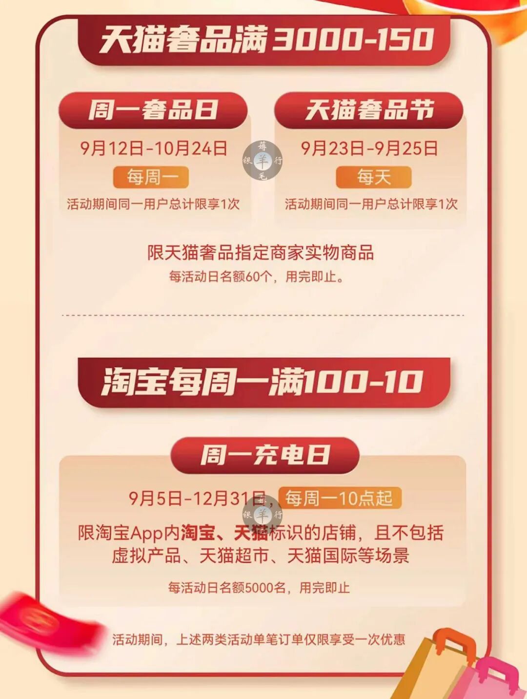 1、每周一10点,淘宝APP,满100减10元,日限1次