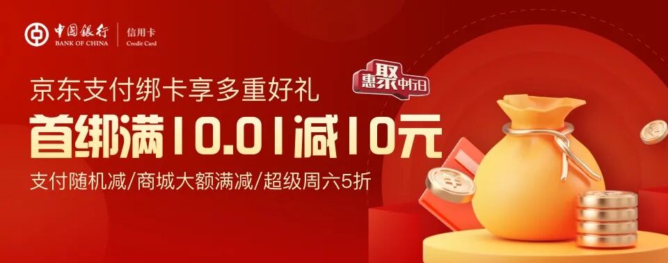 活动期间,中国银行信用卡持卡人通过京东支付完成首次绑卡,在京东商城(APP/网页版)、京东到家APP等活动指定平台通过“京东支付-中国银行信用卡”购买实物类部分商品和部分虚拟商品(不支持代付类型),可享单笔订单商品应付金额满10.01减10元优惠,活动期间每日优惠名额为3000,先到先得。活动期间同一用户限参与一次。