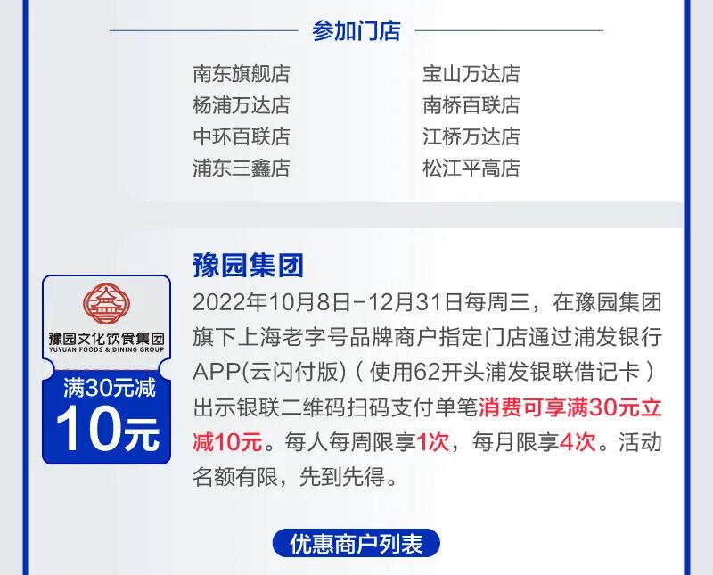 4、每周三10点,第一食品门店100-30、豫园旗下商圈门店30-10,月各限4次