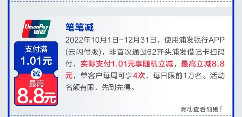 1、每日,扫码付消费,满1.01元随机减最高8.8元,周限4次