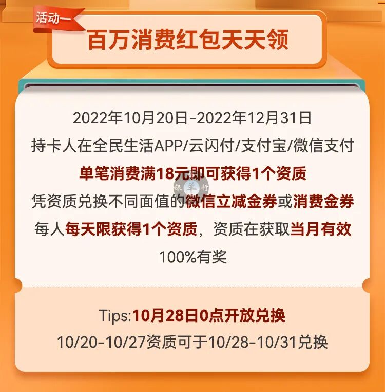 1、全民生活/云闪付/支付宝/微信单笔消费满18元,抽:1-100元微信立减金、随机金额消费金,日限1次(10.28开放抽奖)