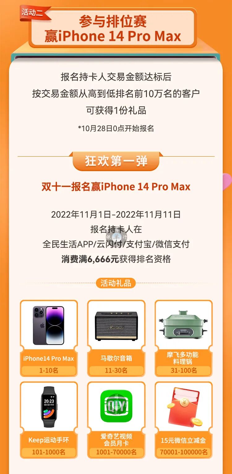 2、报名,11.1-11.11全民生活/云闪付/支付宝/微信消费满6666元,可参与排名活动,按消费金额排序1-10万名可得:苹果手机、音箱、摩飞料理锅、运动手环、爱奇艺月卡、15元微信立减金