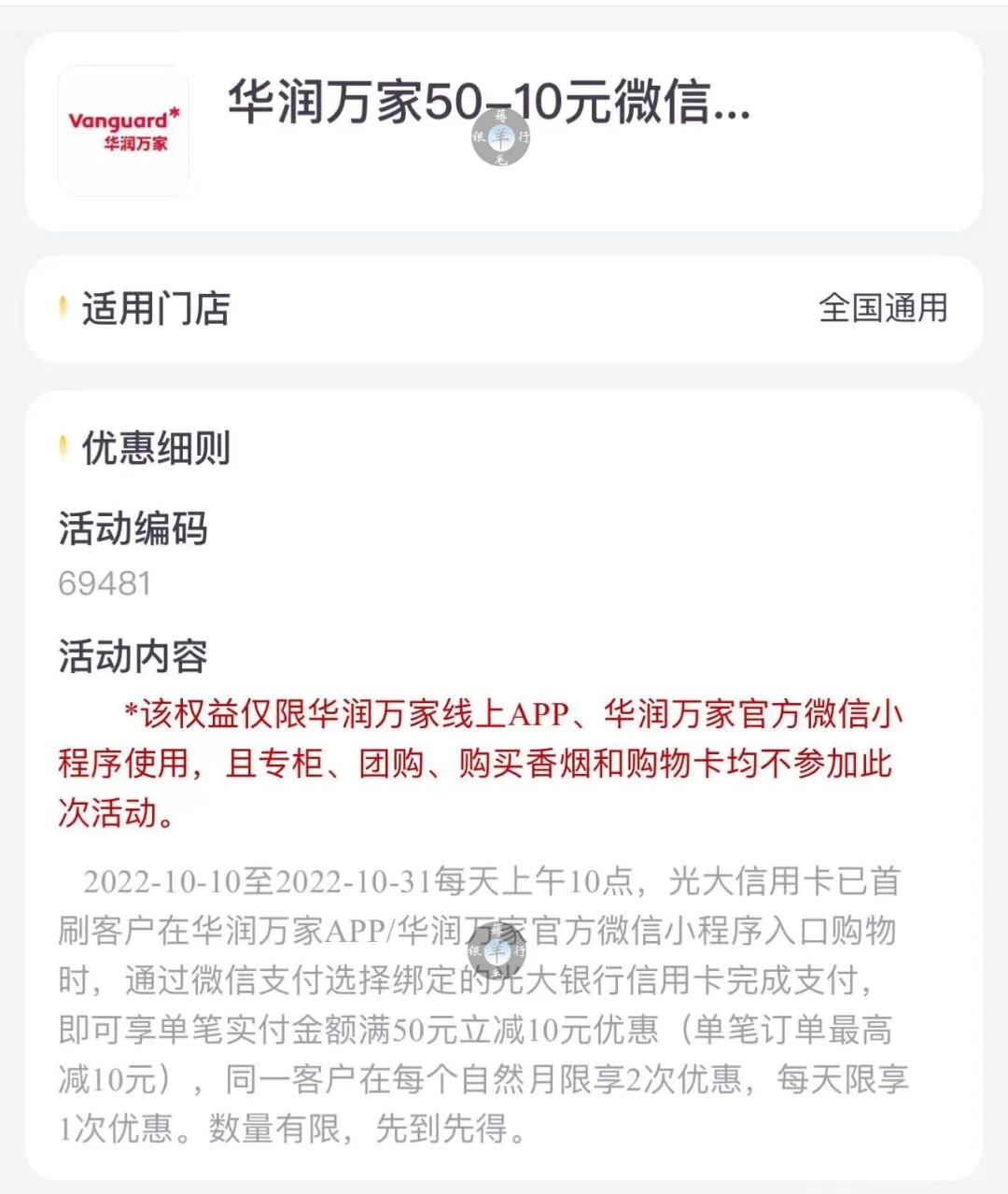 每日10点,华润万家APP,微信消费,满50减10元,日限1次、月限2次