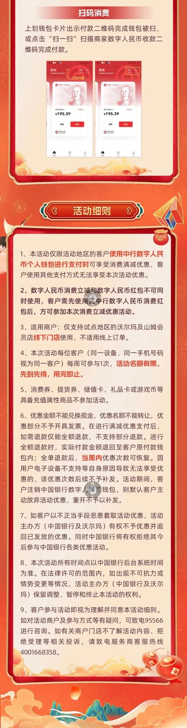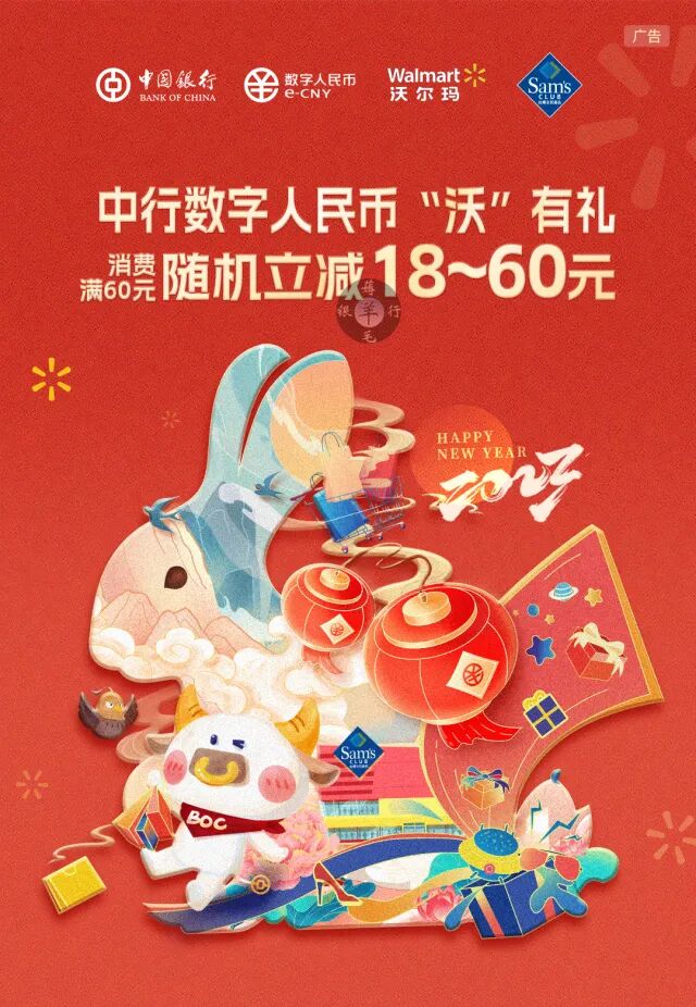 活动地区沃尔玛/山姆门店,中行数字人民币消费,满60元随机减18-60元,周限1次