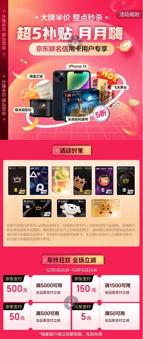 活动银行:中信京东PLUS卡、平安京喜卡、农行京东PLUS卡/京喜卡、招行京东卡/浦发京东卡(这2家银行要求批卡时是新户首卡)