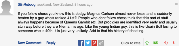“问题来了:请问尼曼在想要把它拉出来之前能忍受多少次屁屁的震动?我猜他可能最好的希望是靠10步就干掉对手。”“我猜我关注的点可能有点怪,不过,如果这个疯狂的传言是真的,那我倒是觉得这孩子不可估量。因为按现场情况看,在一场和世界最好的棋手对决赛中,他一边不停地在接收&正确解读外界通过一个震动头传到他屁股的摩斯密码信息,一边保持绝对的镇定,尽管明知比赛已经通过镜头被直播给全世界无数观看者。这最终成为这个年轻人制胜的绝招?没有任何一个人发现了他的‘摩斯密码器’在震动,这难道不是一项令人惊叹的控制与表现天赋么?”“试想如果每次比赛前官方进行身体扫描,却发现尼曼的座位上传来一声发现交流电的震动声音…”“如果他自己都公开承认过曾两次参与作弊,那他还有资格在之后继续参加其他比赛么?”卡尔森几乎没输过,却突然成了一名世界排名41位的棋手的手下败将?!不了解象棋的人可能会根据电视剧情节来推断这事的确是可能发生的。但天才棋手是非常早现的,会在远远早于尼曼现有的年龄前就惊艳四座。这件事就像短跑名将波尔特在一场比赛中突然输给了一个排名世界40位的运动员。“那些还没看过尼曼pk卡尔森现场的网友们,这里是抄送:”