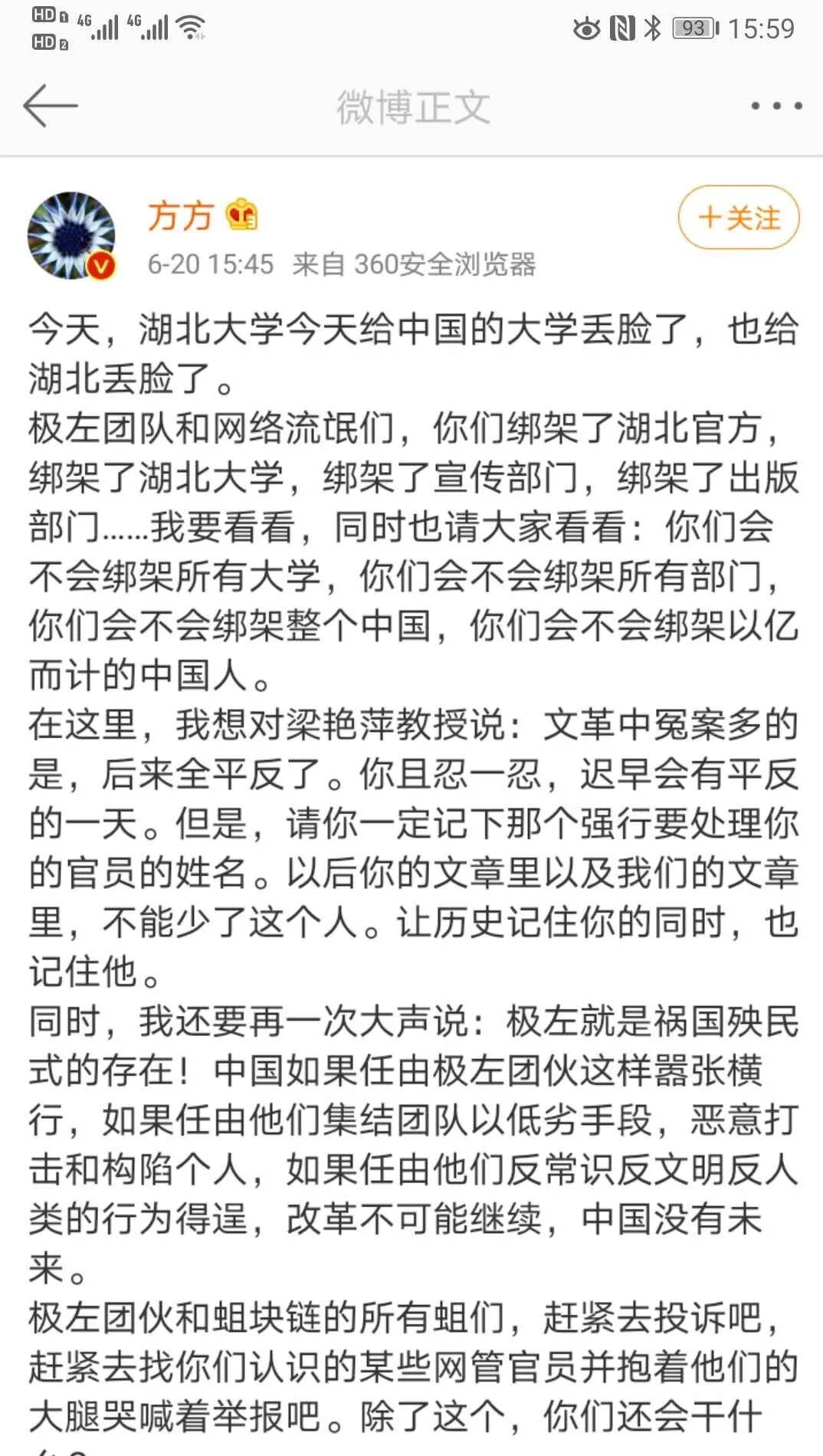 请问,在为其鸣冤抱不平的方方老师看来,梁艳萍的这些言论还都是正确的了?湖北大学和学校党委根据她的这些言论,依法依规给予梁艳萍的处分还都是错的了?下面,我就给方方老师详细科普一下,看看依据党的十八大后出台的系列党规党纪,梁艳萍的行为到底应该受到什么样的惩罚。1. 制定于2016年10月的《关于新形势下党内政治生活的若干准则》,明确提出:(党员)不准制造、传播政治谣言及丑化党和国家形象的言论。2. 制定于2016年10月的《中国共产党党内监督条例》,第三十六条提出:党员应当本着对党和人民事业高度负责的态度,积极行使党员权利,履行下列监督义务:……(三)对错误言行敢于较真、敢于斗争。3. 制定于2016年1月的《中国共产党纪律处分条例》,第二十九条提出:对有丧失党员条件,严重败坏党的形象行为的,应当给予开除党籍处分。这里已经比较明确地说明了处理方式,但鉴于“严重败坏党的形象”不好判断,确实留有商榷空间。不要紧,这个条例还有分则,在分则第六章“对违反政治纪律行为的处分”中,第四十五条提出:通过信息网络、广播、电视、报刊、书籍、讲座、论坛、报告会、座谈会等方式,公开发表坚持资产阶级自由化立场、反对四项基本原则,反对党的改革开放决策的文章、演说、宣言、声明等的,给予开除党籍处分。通过信息网络、广播、电视、报刊、书籍、讲座、论坛、报告会、座谈会等方式,有下列行为之一,情节严重的,给予开除党籍处分:……(三)丑化党和国家形象,或者诋毁、诬蔑党和国家领导人,或者歪曲党史、军史的。违背社会公序良俗,在公共场所有不当行为,造成不良影响的,情节严重的,给予开除党籍处分。对方方老师而言,我不知道梁艳萍身为党员公然否认历史,美化日军侵华、美化日本参拜靖国神社,用“支那”这样的词汇侮辱全体国人,而且拒不认错,在全国引起如此舆论风潮,这样的言论、行为、影响,是不是还不算情节严重?好,就算这些在方方看来都没有触及底线,在《中国共产党纪律处分条例》中还有适合她的条款:第十一条 党员留党察看期间,坚持不改或者又发现其他应当受到党纪处分的违纪行为的,应当开除党籍。第二十条 党员违纪受到党纪处分后,又被发现其受处分前的违纪行为应当受到党纪处分的,应当从重处分。如果这样的人还算个党员,那是不是今后她们可以这样介绍自己了:写了这么多,我的意思很简单,遍查十八大后党规党纪,梁艳萍的言论行为都只有从重处分的理由,没有一点减轻处分的资格。如果真要说起来,大概就是很多网友质疑的,为什么还要保留其教授身份?这样的人还称得上为人师表吗?“第四十一条 对于违纪行为所获得的职务、职称、学历、学位、奖励、资格等其他利益,应当由承办案件的纪检机关或者由其上级纪检机关建议有关组织、部门、单位按照规定予以纠正。”条例我帮忙查好了。如果查出其他问题,请记得照此执行。整个事件中,最让大家所不能忍受的,除了梁艳萍满口的“歪曲历史”、“美化侵略”、“辱华言论”,更在于她的身份:教授、博导、党员……她虽然打心眼里瞧不起这个生她养她的国家,虽然从来没有一丁点的党员意识,但这丝毫不影响她利用各种投机手段,在体制内得到利益。这样的人,钱理群教授早总结过,就是“精致的利己主义者”。他们惊人地世故、老到,很懂得配合、表演,很懂得利用体制的力量来达成自己的目的。而这样的人,一旦掌握了权力,其对国家的、民族的损害,是大大超过那些昏官的。——钱理群几年前一件很著名的新闻:曲婉婷的母亲张明杰将价值23亿的国有种场土地以不到2000万的价格卖给奸商,然后又用3.5亿把土地征回来。这个过程中,解散了种场原有职工,既没有按当初说的进行返聘,也没有足量发放安置费,导致这些下岗职工生活陷入贫困。而那些被解聘的职工,因为买不起蜂窝煤,在哈尔滨零下30度的天气里,捡碎煤块烧取暖,自来水管在低温下纷纷冻裂。接受采访时,曲婉婷没有愧疚,而且理直气壮地说她的母亲是英雄。在写给她妈妈的歌里,她唱到:I don’t care what people say。曲婉婷能出国,读商学院,能过上精致富足的生活,能玩她的音乐,移民,都要归功于她母亲的贪腐。她的精致背后,是吃人的血,是无数在东北寒冷的冬夜里瑟瑟发抖的下岗职工。是因为我无数次地写过了,像她们这样的人,决不可能因为一次两次“事件”,就完全改变了自己的思想。梁艳萍一边骂着国家,一边不动声色地去享受这个国家和体制带给她的好处,在党支部会议上,估计还得说几句“四个自信”的话。但她没有,她打心眼里就像是在做一笔生意一样,盘算着成本、收入。当她们继续寄身于体制内,成了精英后,破坏力会更大,因为她们会努力想要带坏更多的年轻人。当我们疯狂吐槽体制内有些人,学术造假,教授欺凌,公职人员贪污渎职的时候,有没有想过,很可能就是因为这些人,更善于钻营、善于伪装,混到了社会的这个位置,成为这个社会里的“既得利益者”,是她们在蛀空这个国家。高尚不一定能成为高尚者的墓志铭,但卑鄙多半能成为卑鄙者的通行证。剧变前,享受特殊待遇让老百姓咬牙切齿的是那些“既得利益者”,不是普通百姓、普通党员。剧变中,强烈推动改革的的还是这些人。1991年3月17日,苏联就“是否赞成保持苏维埃社会主义共和国联盟”
