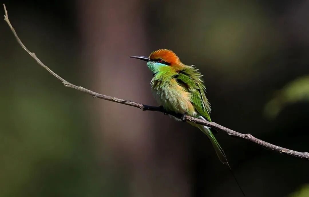 * 绿喉蜂虎(学名:Merops orientalis)是佛法僧目、蜂虎科的小型鸟类,共有9个亚种。身长22-25厘米,翼展29-30厘米,体重15-20克。喉绿色,额部、头顶至上背为锈红色,其余上体均为亮绿色。中央尾羽延长且端段狭细,超过侧尾的长度为跗蹠的2倍长度以上;嘴细长而向下弯曲,为黑色。鼻孔裸露;初级飞羽10片;尾羽12片;体羽质密、正常且无纵纹;尾凸形,中央尾羽特形延长且端部形狭或尖削,翅长而尖。羽色艳丽,栖息于林缘疏林、竹林、稀树草坡等开阔地区,常单个或成小群活动。大多在空中飞翔捕食。休息时多栖于树枝和电话线上,主要以昆虫为食。