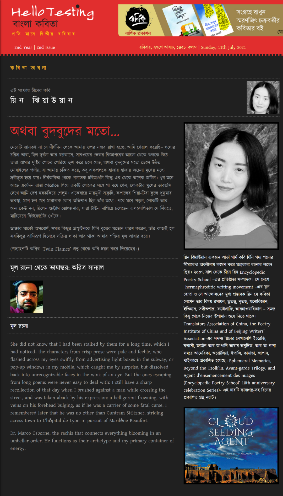 2021年7月11日,总部位于印度加尔各答的孟加拉语文学&电影艺术跨界杂志《Hello Testing Bangla Kobita》(“hello testing”是拍摄电影试麦的标准用语)的"Kobita Bhabona"栏目刊登中国诗人、百科诗派创始人殷晓媛跨文体长篇作品《双生火焰》节选。译者为孟加拉语诗人、学者、国家级媒体前体育记者阿里特拉•桑尼亚。