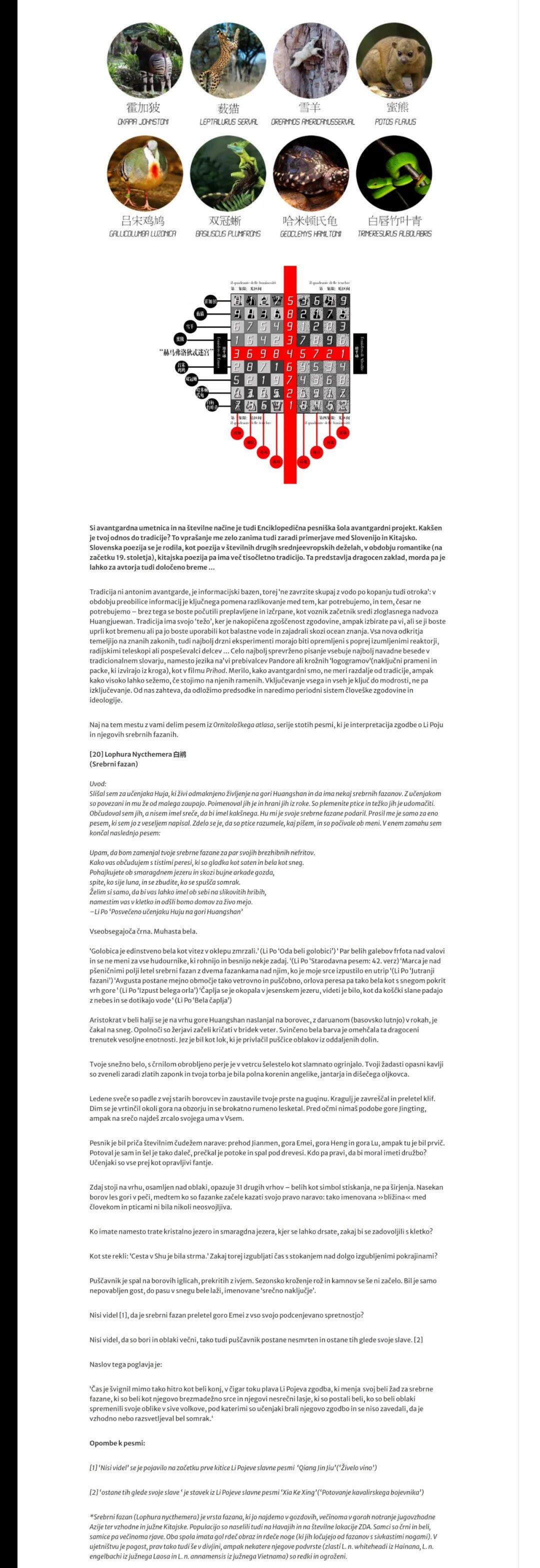 6. You are an avant-garde artist and in many ways the Encyclopedic Poetry School is an avant-garde project. What is your attitude to tradition? This question is very interesting to me because of the comparison between Slovenia and China – Slovenian poetry was born, as in so many Central European countries, in the Romantic period (at the beginning of 19. Century), while the Chinese poetry tradition dates back millennia. Such a tradition is an extraordinary treasure, but maybe it can also represent a certain burden for the author …