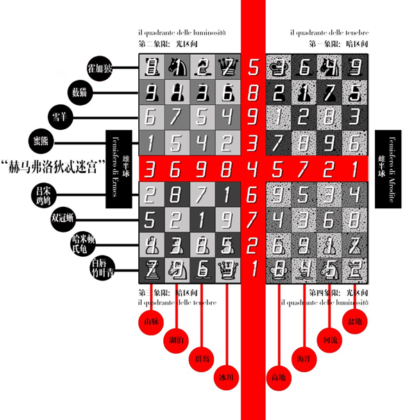 我将2019年创作的复合文本《赫马芙洛狄忒迷宫》视作实现这一理念道路上的重要里程碑,是我对于极致对称、精妙平衡的追求的具象化。在这部作品中,世界被置于四大象限之中,与9×9数独交叠——在这部小说中,“1号玩家”不得不与隐藏在棋盘背后的邪恶A.I.进行交流。每新走一步棋,就必须根据在棋盘中的位置及设计,根据"要求"讲故事,否则会遭到电击。第一、第四象限为“雌半球”,必须相应讲述女性主人公的故事;第二、第三象限则为“雄半球”。同时,第一、第三象限为“光区间”,第二、四象限为“暗区间”。每一行与一种稀有动物相关联,而每一列指则指向一种地形。数独中出现的数字定义了故事的类型,8代表神反转,类似《调音师》的情节。例如,当棋子移入A5,男主人公必须即兴创作一个故事,发生在白天的山上,主角为具有蜜熊性格特征的男性(人类)或雄性(动物)。数独数字为1,代表“上帝视角”,因此他必须以全知的口吻讲述故事。文中,他讲述了一名男性登山者偶遇野人“夜帝”的故事。