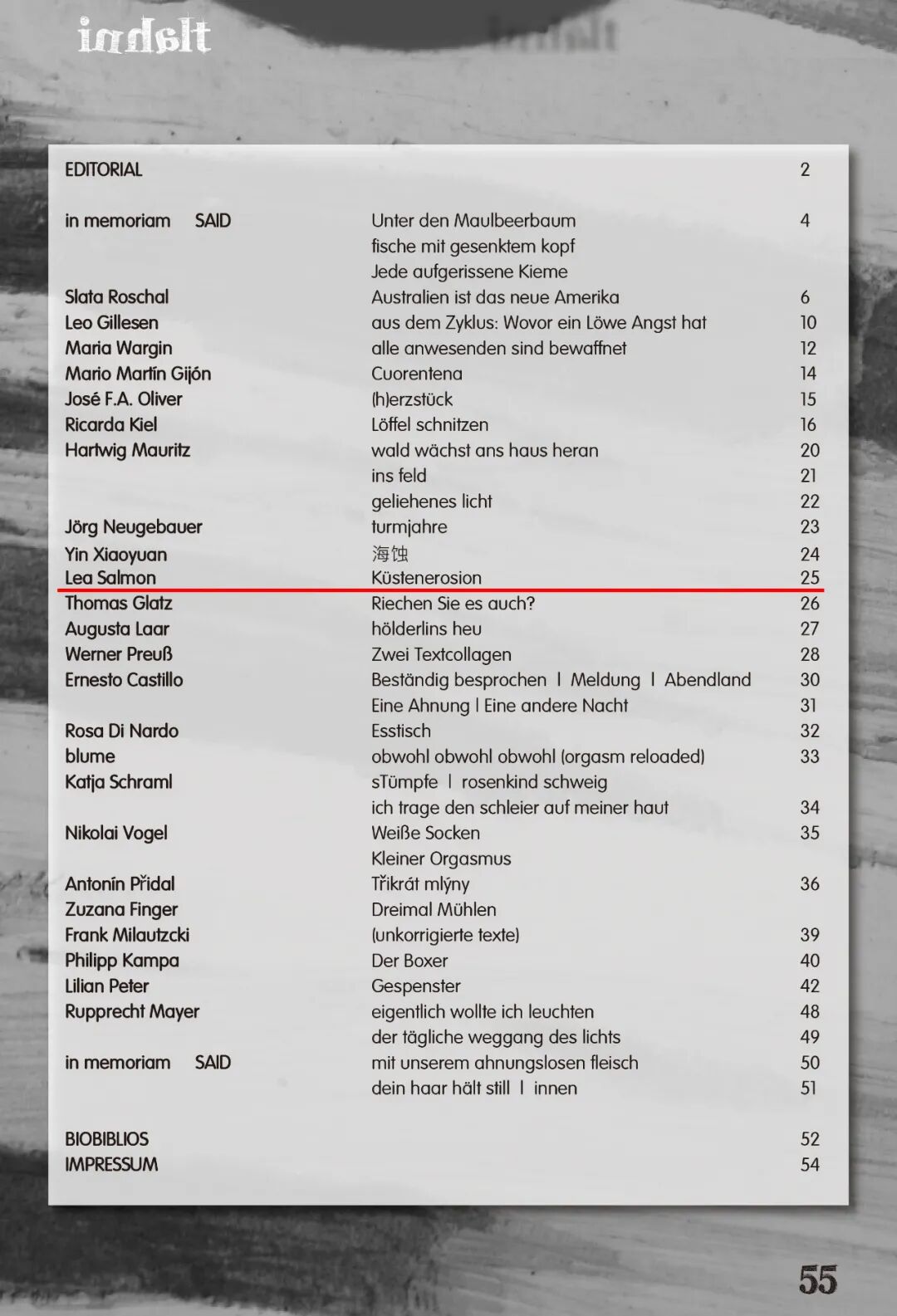 2021年11月,《慕尼黑文学》总第28期发表中国诗人、百科诗派创始人殷晓媛作品《海蚀》(选自其2013年创作的“摄影系列组诗”),德语译者为跨文化学者、翻译家李•萨尔蒙(Lea Salmon)。