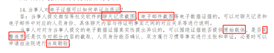 在计算机软件合同纠纷案件中,《举证手册》对电子证据作了明确要求:证据要提供原始载体、完整连贯、人员身份能确认、双方履行习惯等事实进行主张和举证,必要时可以申请由法院进行当庭勘验。