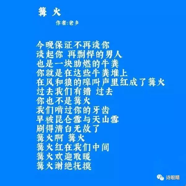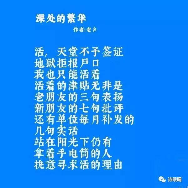 自嘲是老乡诗的一大特点。他擅于自嘲,其中妙处往往能让人会心一笑。和一些诗人的无力感和挫败感不同,老乡既不愿向命运屈服,他的自嘲不仅仅是性格中的幽默与困境中的苦中作乐,更是一个诗人天性豁达大度的体现,也是饱经世事后养成的淡泊品格。
