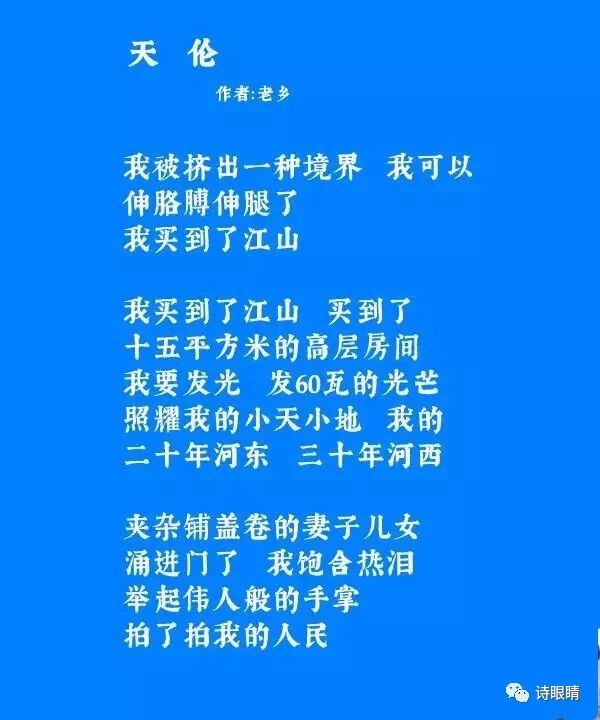 李老乡的这首《天伦》我看到了这种担当。也就是前面提到的对“根基”写作的坚守与“共验”写作的作为。