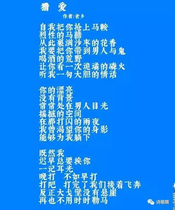 老乡的诗有股野劲儿, 那种不可遏制的对自由的向往,正如他爱用“野天野地”抒发感情一样,他的诗思是狂野的,他海阔天空的行文,无拘无束的个性,落笔之处,简直是云雾蒸腾,情至文至。读他的诗,你可以想象他的坦荡与大度,让人读其诗,想见其人。