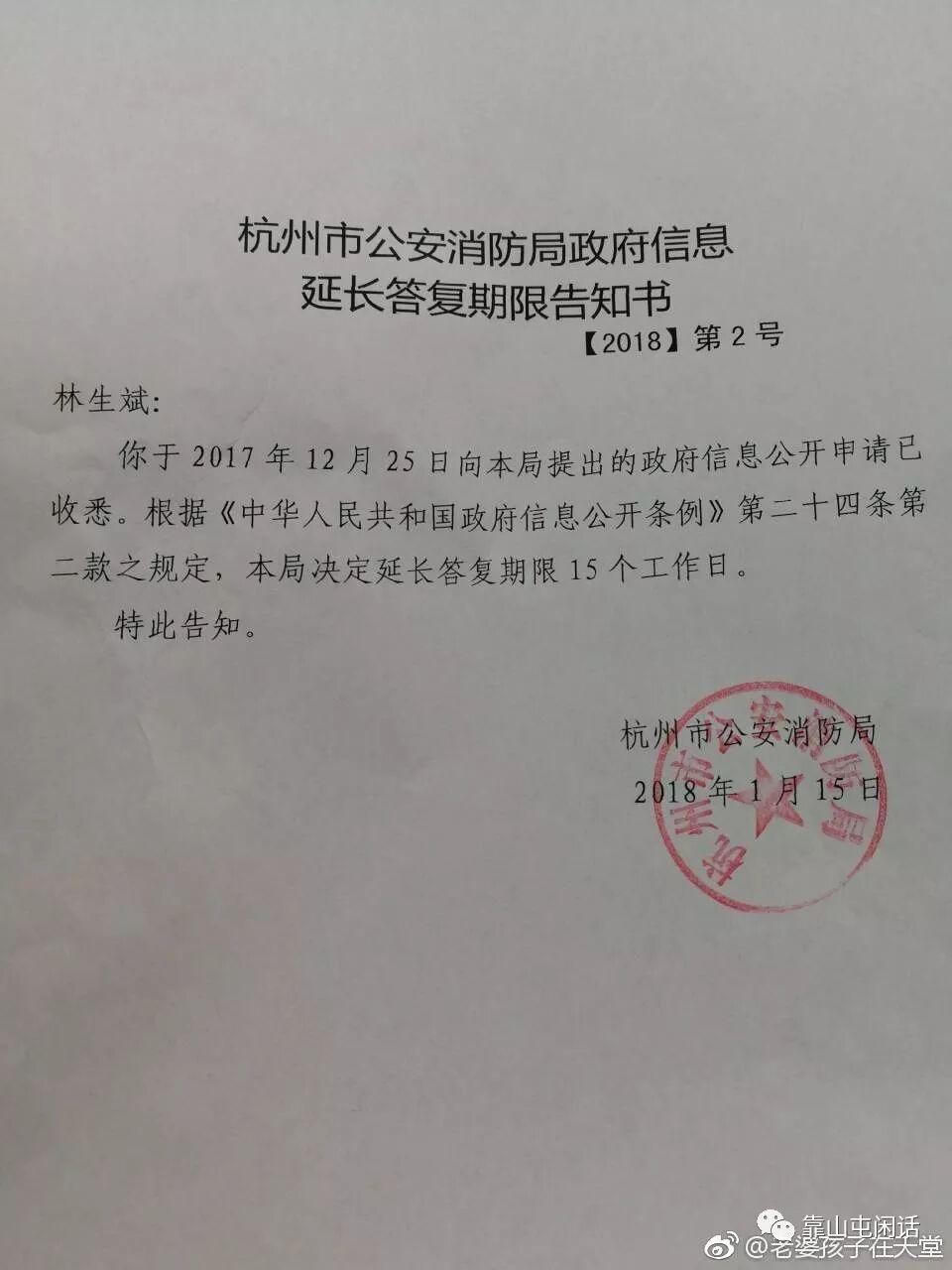 去年12月25日,林生斌提出信息公开申请之后,杭州消防局已经依法作出受理。