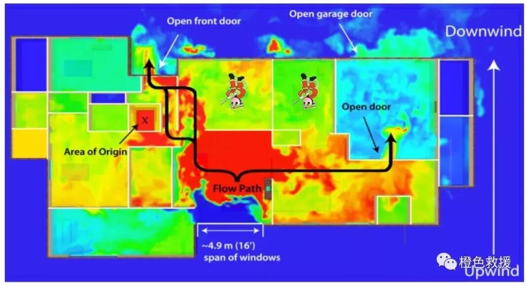 这张图片也是一样,由于房门打开,2分钟内,室内发生轰燃,火势扩大,救援失败。