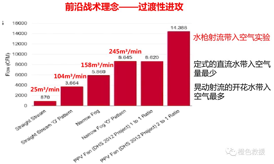 这张图中,直流射水带入的空气量是25m³/min;直流射水加O形状绕动带入的空气量是104m³/min;开花水枪是158m³/min;开花水加O形绕动,是245m³/min,相当于排烟机正压送风的空气量。