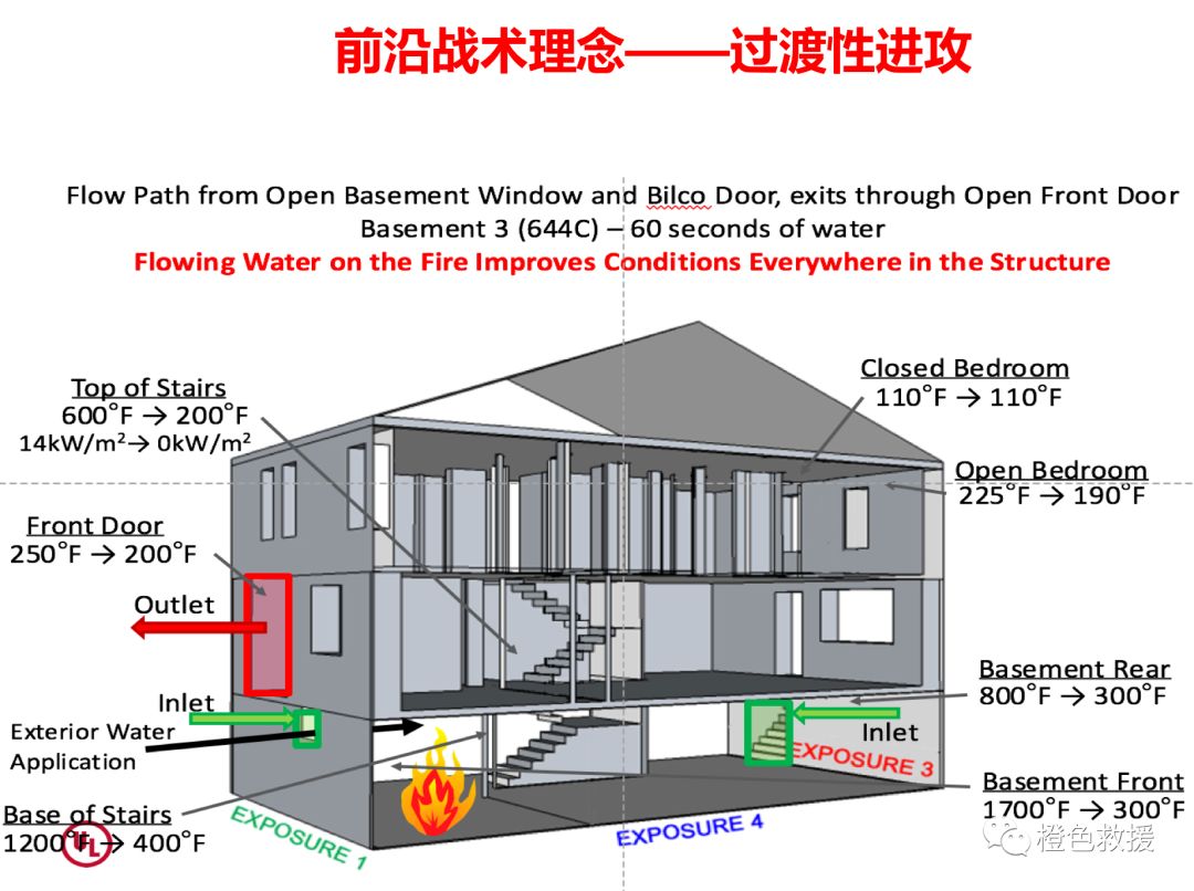这张图也是一样,地下室发生火灾,外部射水,整个火场温度下降。那么一说到外部射水,很多人都会说,外部射水会把火往室内赶,加剧火势蔓延。美国消防员以前也这样认为,通过UL实验室的大量真火模拟实验,美国消防员基本上不再认为外部射水会赶火了。
