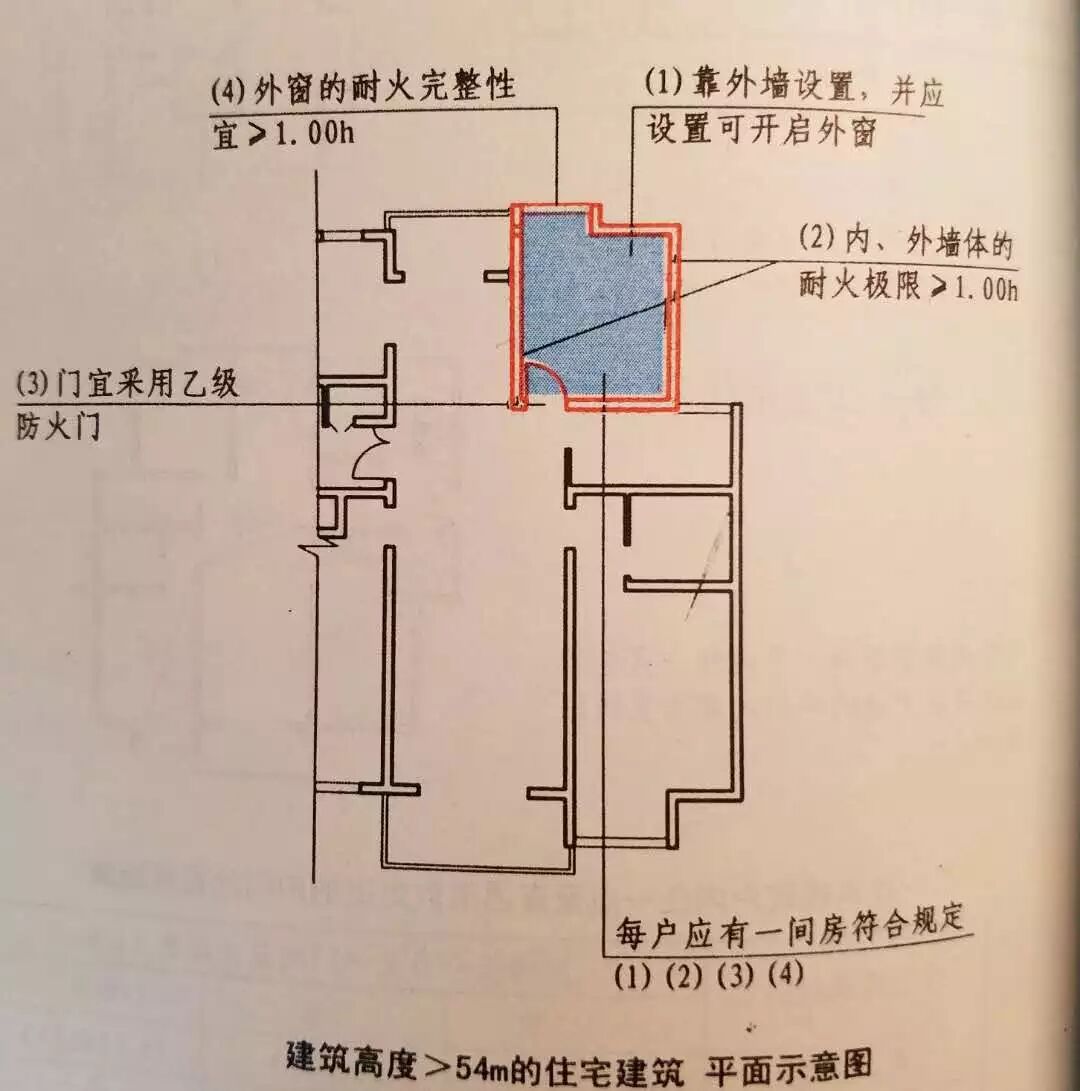 建筑高度大于54m的住宅建筑,每户应有一间房间符合下列规定:
