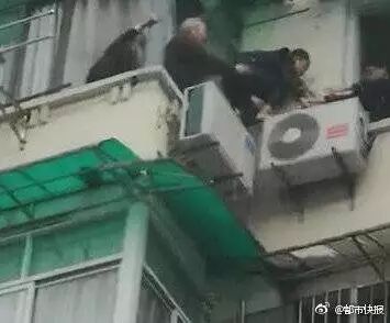 (6)爬窗逃生:在隔壁单元502小伙子的指导下,大伯带着两个女孩,顺着窗户外空调机壳逃到了小伙子家。