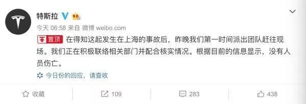 (9)特斯拉官方回应:“在得知这起发生在上海的事故后,昨晚我们第一时间派出团队赶往现场。我们正在积极联络相关部门并配合核实情况。根据目前的信息显示,没有人员伤亡。”