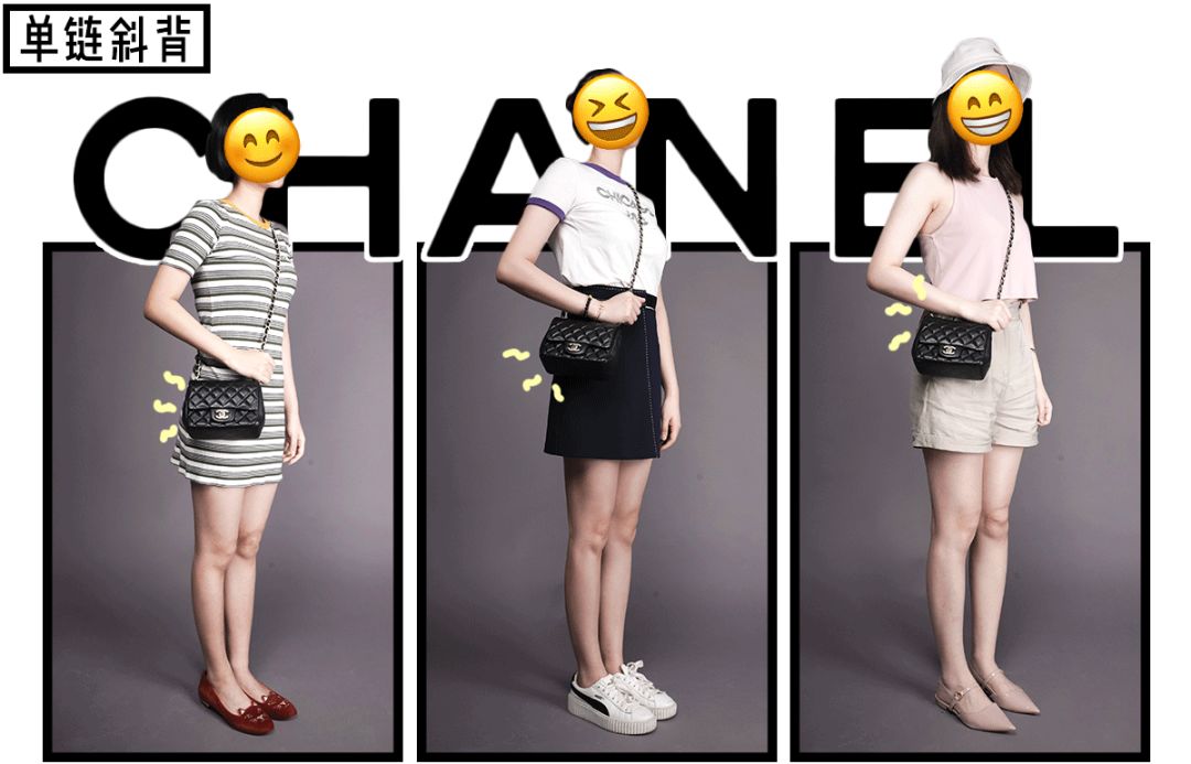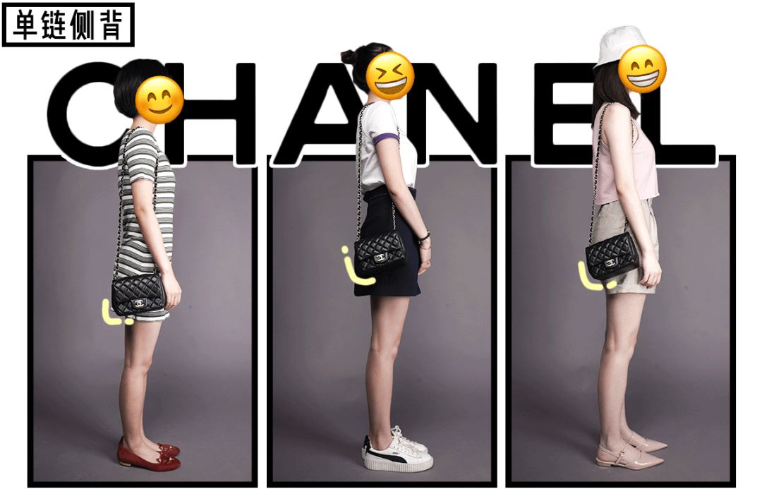 我让小姐姐们试了最常见了两种背法,交叉斜挎还有单侧斜背。可以看出尺寸和链长对矮个是友好的,170+以上的女生背显得包很mini~👇