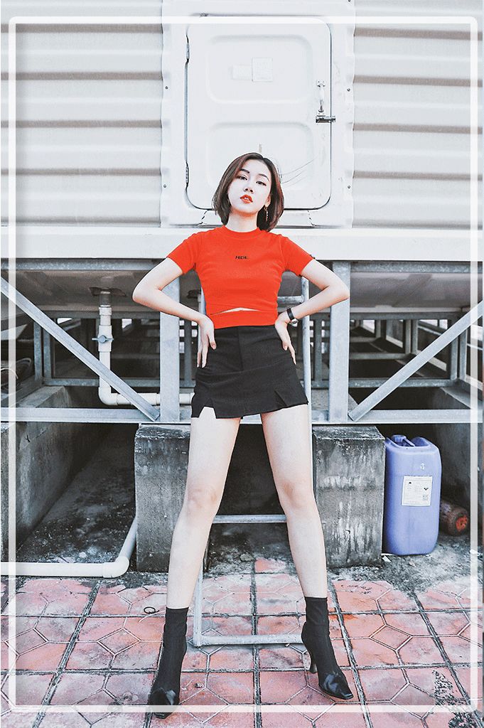 上衣是一件紧身短T,这件衣服最近很火啊,光在公司里我就跟同事撞衫了,只不过穿的是不同颜色。我买的是实物略暗的红色,上身显白,和M·A·C的ruby woo超级搭💄