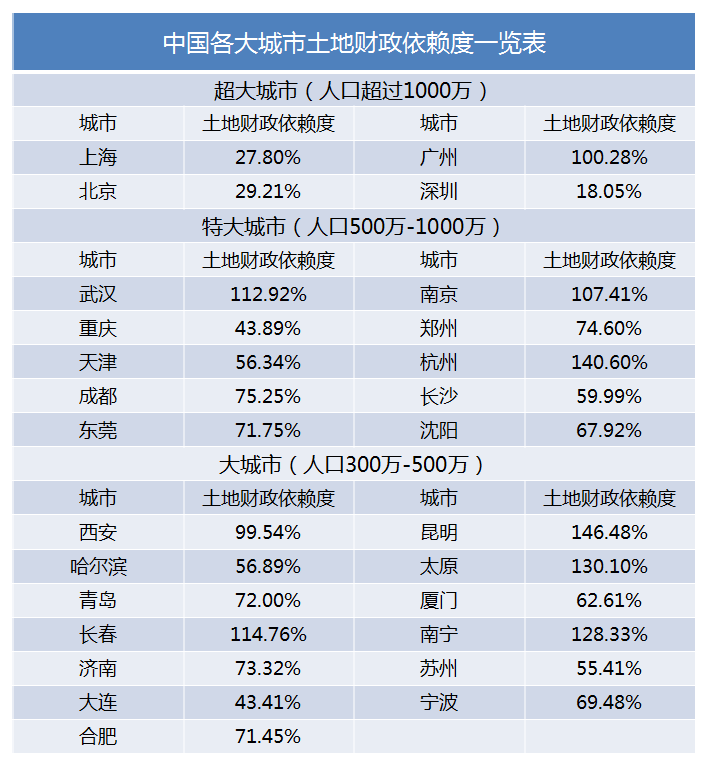 表:各大城市土地财政依赖度,来源:网络公开数据,智本社