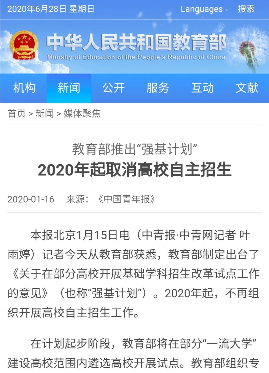 2020年,教育部取消了自主招生,改而推行更注重基础学科的“强基计划”。