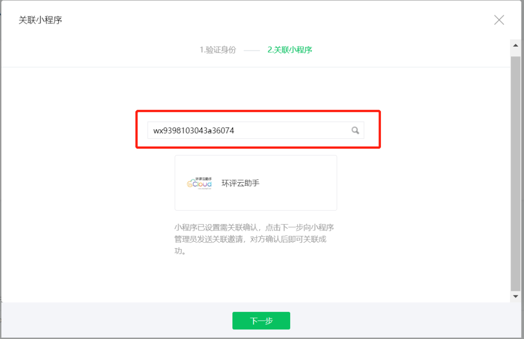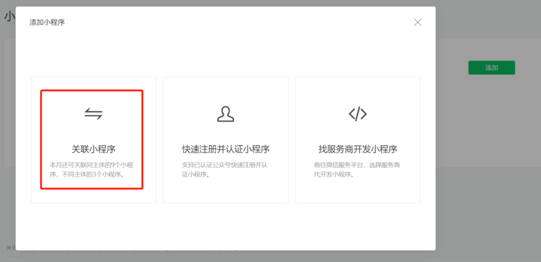 2. 左侧导航栏->小程序->开通->关联小程序->填写小程序appId->发起关联邀请->等待审核