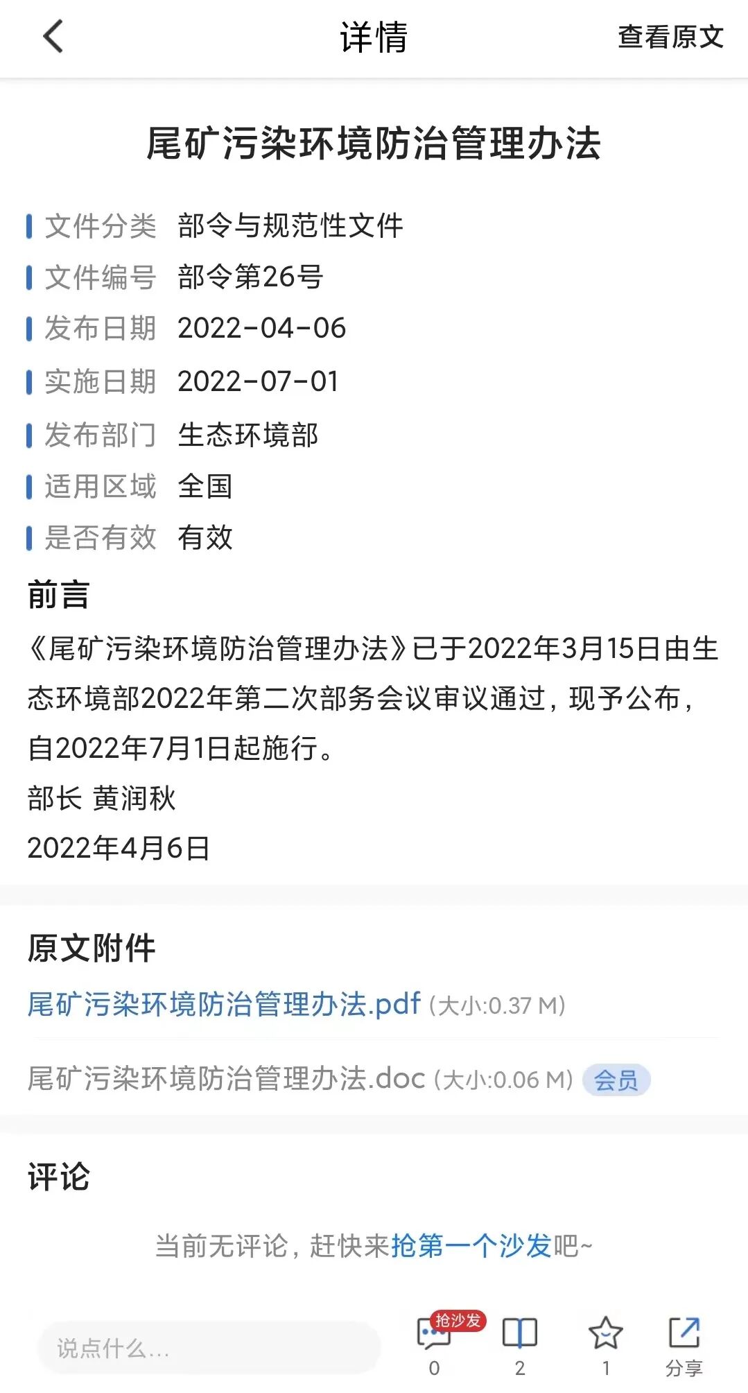 第三十五条 本办法自2022年7月1日起施行。《防治尾矿污染环境管理规定》(国家环境保护局令第11号)同时废止。