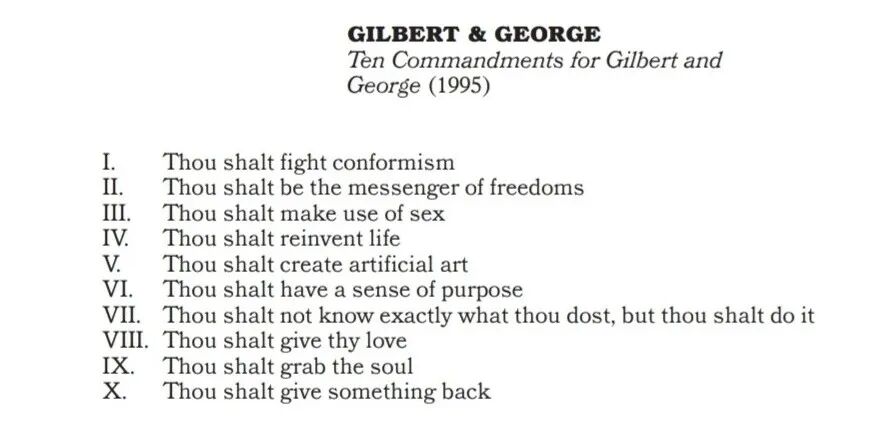 翠西·艾敏 (Tracey Emin)[3] - 翠西会怎么做?(2007)拿张桌子。在桌子上放27个瓶——每个都有不同的大小和颜色。拿出一卷红色的棉花,把它缠绕在瓶子上,像一张奇怪的网,把它们连在一起。如果你愿意,你可以把这卷棉花放在桌子下面。*EMIN,Tracey,英国艺术家,作品经验许多来自其动荡的家庭、童年,混乱的青少年时代的遭遇,以及相互纠缠的亲密关系、怀孕和堕胎等个人经验。她的作品呈现了对于爱、欲望、失落、悲伤、孤独等核心主题的动人探索,在此过程中展示了身为「女性」和「自我」的精微意涵。GILBERT&GEORGE - Ten Commandments for Gilbert and George (1995)