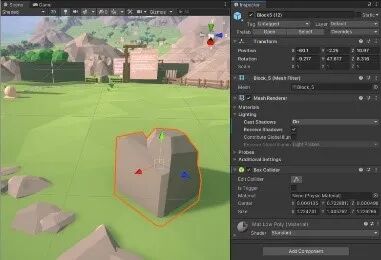 到目前为止,我已经谈到了游戏物的体验。但图4显示了在我使用的Unity3D游戏引擎中制作游戏的样子。我选中了中央的岩石对象,其属性在右边是可见的。如果我取消勾选「网格渲染器」(MeshRenderer),岩石就会变成看不见的,但仍能撞到。如果我取消勾选「盒碰撞盒」(BoxCollider),角色将能够穿过它。相较之下,《帅鸽男友》并没有模拟物理学,如鸽子羽毛的空气动力学特性,而是一个由社交互动和关系组成的世界。
