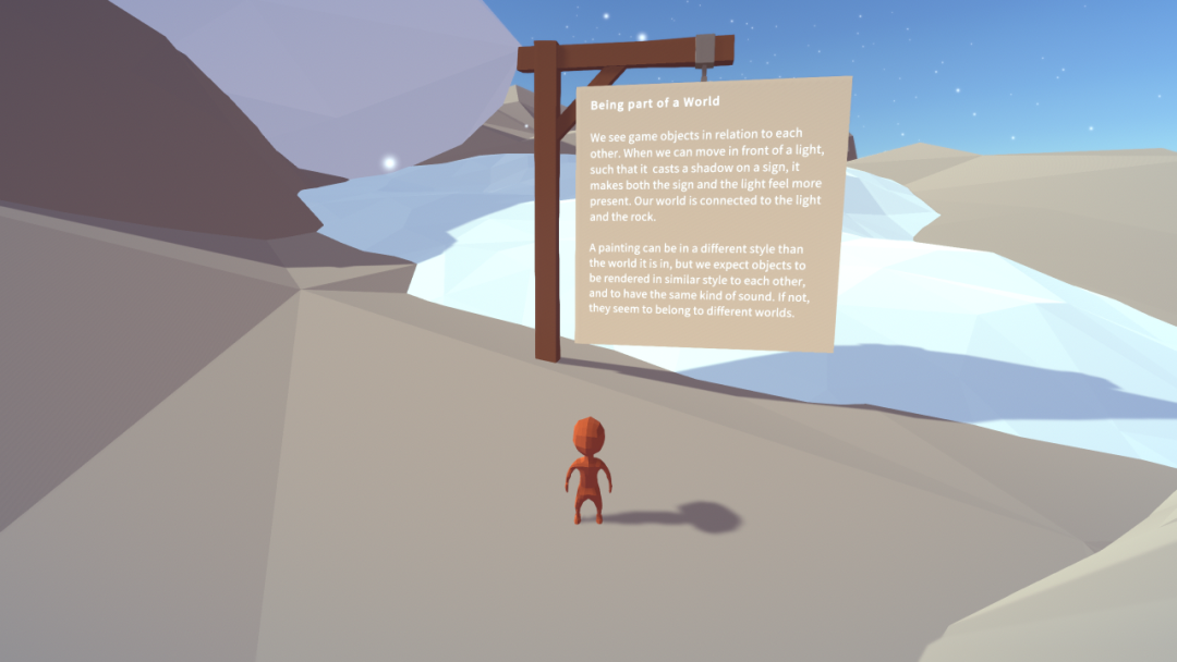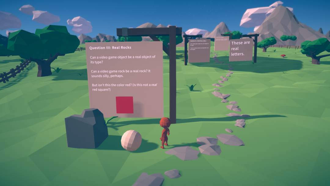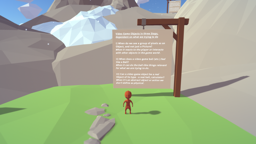 然而,这并不是全部:即使我们无法与灯互动,灯照亮了我们的角色这一事实也让我们觉得它是一个物体,但原因与石头不同。不同类的物使我们对它们提出不同的问题( Different types of objects make us ask different questions to them)。没有碰撞盒的石头是一个幽灵般的临界个案(borderline case),它看起来像一个物体,但表现(behave)得并不太像,就像一个幻影或错觉,而一个不可见(译注:却有碰撞)的物体对我们来说感觉更强烈和与之相关。这显示了 David Chalmers 观点的一个潜在问题,他认为游戏或虚拟世界中的物体是「数字物体」(digital objects),因为它们与底层数据结构有关 [6]:在游戏中,图片、天空盒和幽灵般的物体也与底层数据结构,诸如顶点有关;但这不是我们判断它们的依据。