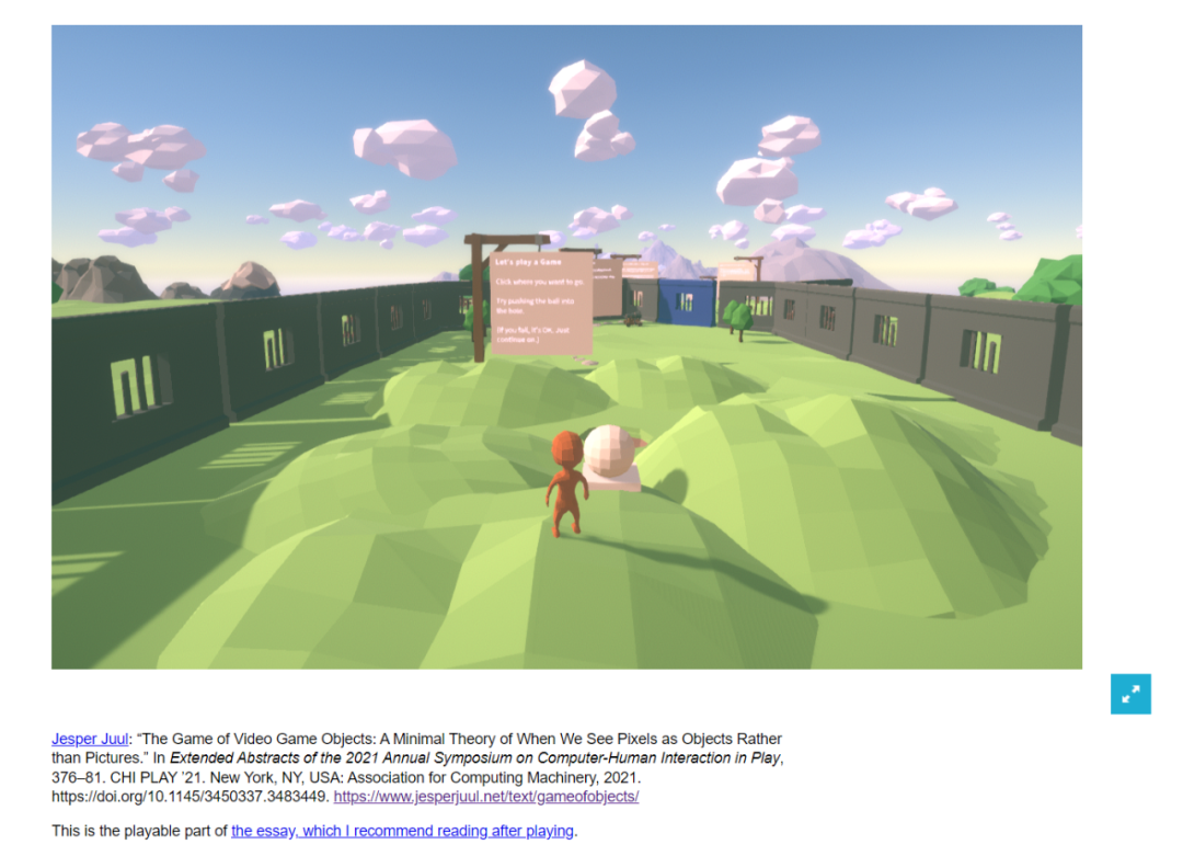 Juul, Jesper. “The Game of Video Game Objects: A Minimal Theory of When We See Pixels as Objects Rather than Pictures.” In Extended Abstracts of the 2021 Annual Symposium on Computer-Human Interaction in Play, 376–81. CHI PLAY ’21. New York, NY, USA: Association for Computing Machinery, 2021. https://doi.org/10.1145/3450337.3483449.