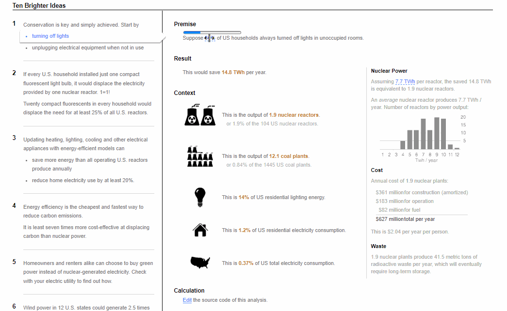 Ten Brighter Ideas[2] 是一个对于反应式文档的我做的早期原型。读者可以把玩各种主张的前提和假设,并立即看到结果的更新。这就像一个无电子表格的电子表格。试一试吧。[3]