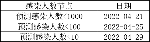 此外,上海疫情感染人数将在 4 月 21 日、4 月 25 日和 4 月 29 日分别降至 1000 例、100 例和 10 例以下(表1)。
