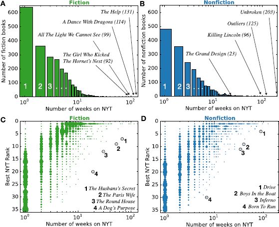 纽约时报畅销书排行榜,The New York Times Bestseller List (NYTBL),电子版的记录始于2008年。对每本书而言,包括ISBN码、书名、作者、出版商、亚马逊链接。该排行榜每周进行更新。本研究中使用了2008年8月6日-2016年3月10日共410周的纸质书排行榜数据,一共包括2468本虚构类书籍和2025本非虚构类书籍。