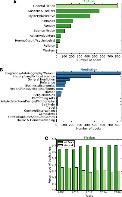 类型小说比一般的虚构类作品更流行,且从2011年起流行度不断上升(图1C)