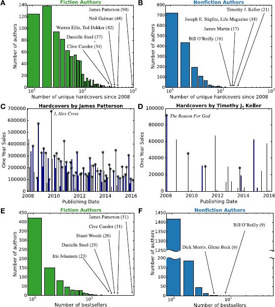 虚构类书籍的作者比非虚构作者更高产,且往往有多本书能够登上畅销书榜。