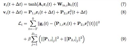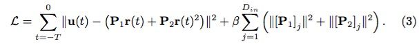 P1、P2 都是 Dout × Dr 维矩阵。由于 t + ∆t 时刻的真实值是时间序列中的 u(t + ∆t),因此训练的目标是找到合适的 P1、P2,使得 v(t + ∆t) 尽可能接近 u(t + ∆t) 。