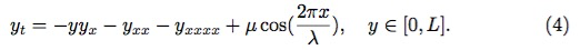 标准的 KS 方程无最后的空间不均项。方程满足周期边界条件 y(x, t) = y(x + L, t),方程的解由系统大小 L 和初始条件 y(x, 0) 决定。关于 KS 方程的详细介绍,可参